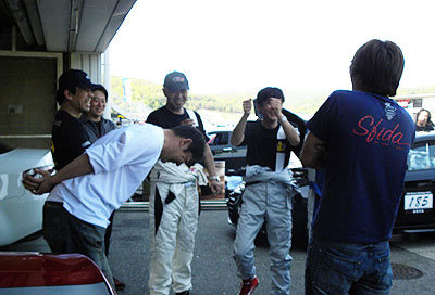 ドキドキのタイムアタック1本目も無事終了です。パドックに戻るとサポートの皆様がsato.yaさまをお出迎え。